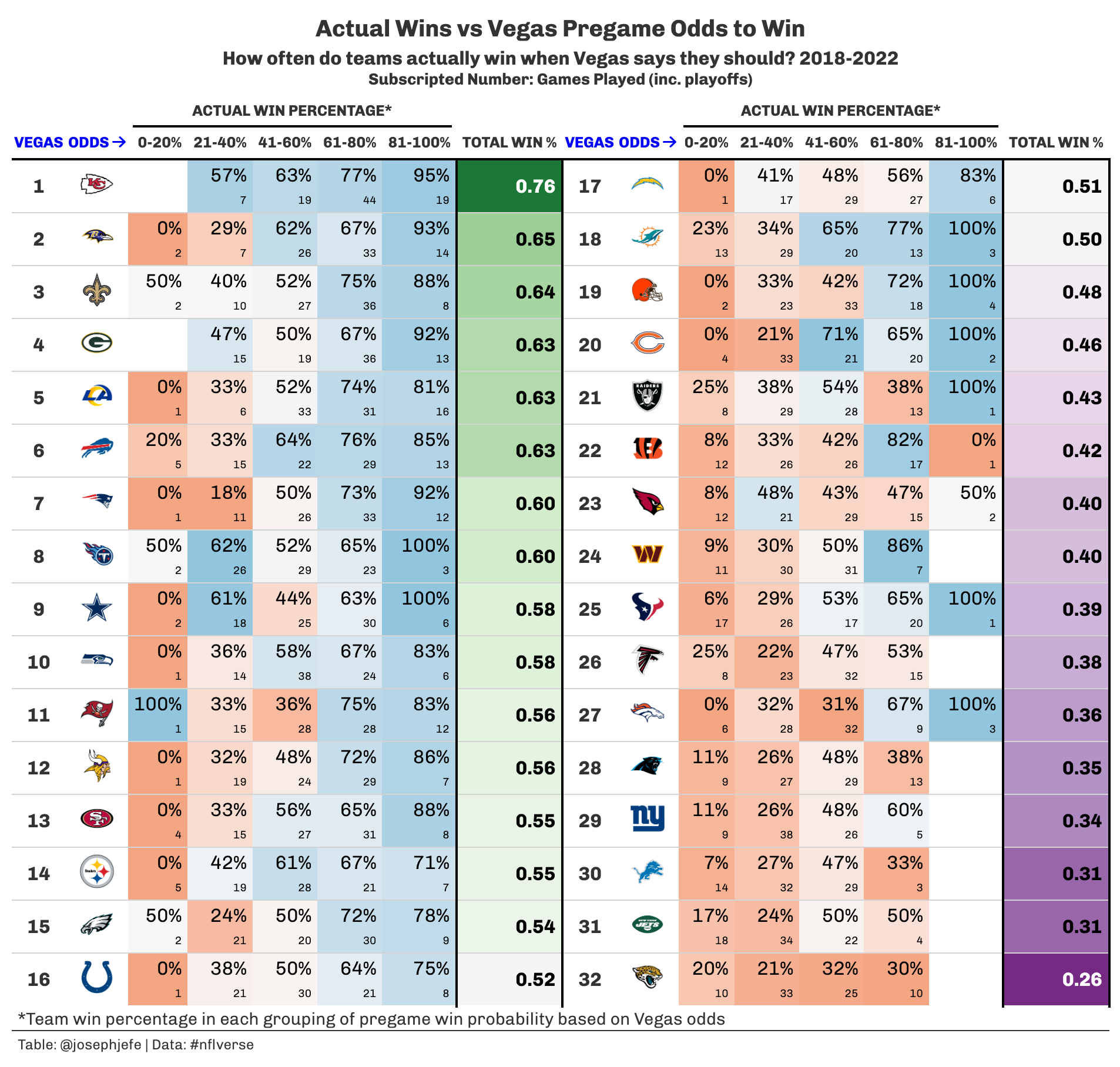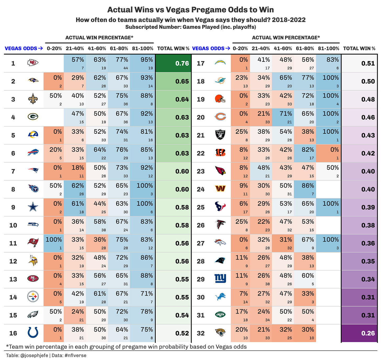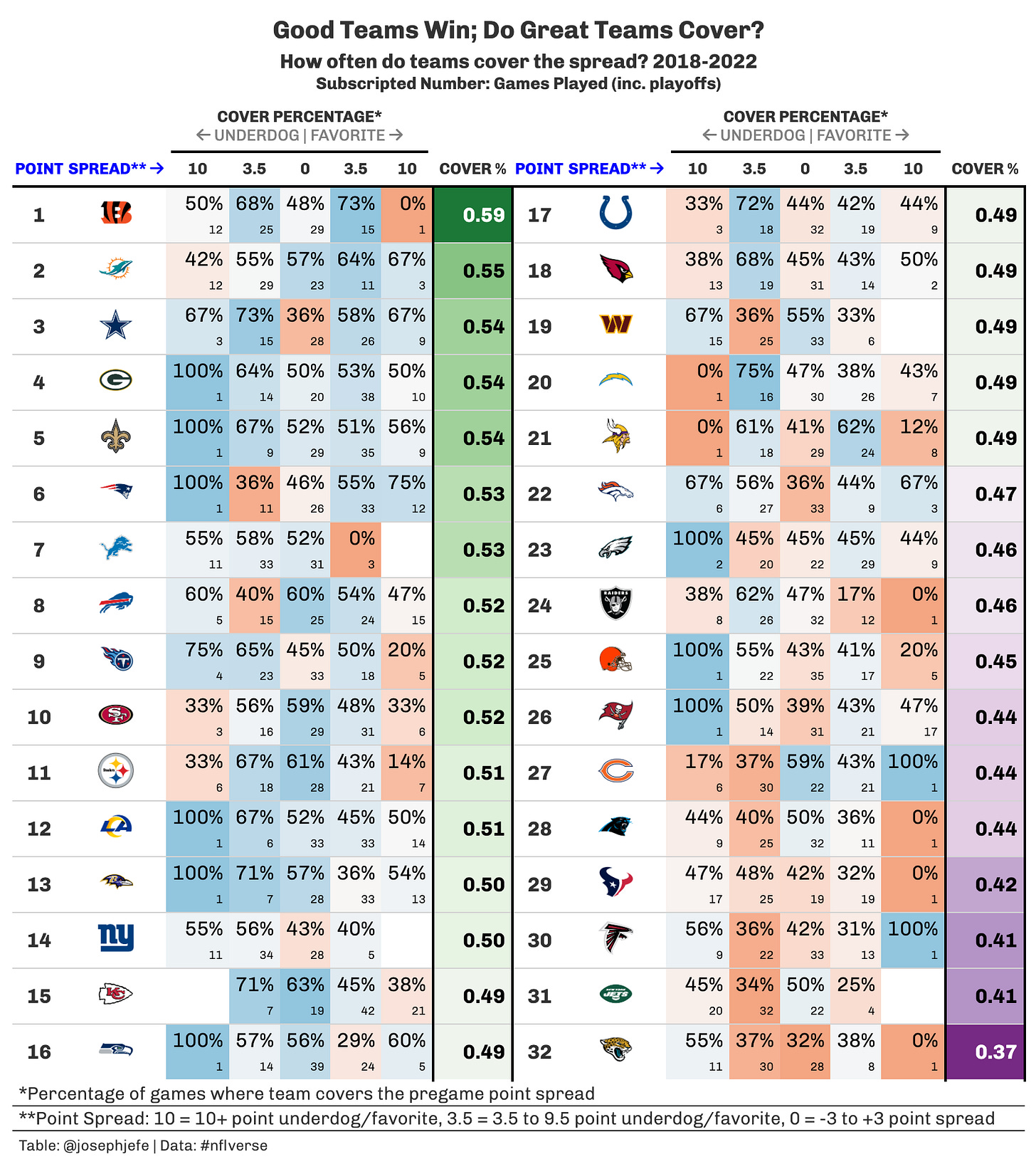Chiefs drop from first overall in the Win Percentage graphic to fifteenth in this one, with 6 other teams tied for that same spot. Reid/KC covers the spread at about a league average rate. For the team with the most overall wins in this time range, that’s a bit surprising.