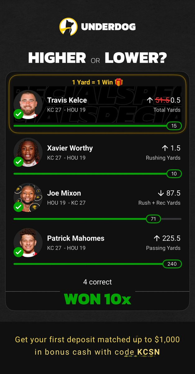 Sign up with promo code KCSN and score up to $1,000 in bonus cash on your first deposit, AND snag a Week 17 Christmas Day Free Pick (Patrick Mahomes HIGHER 0.5 total yards).