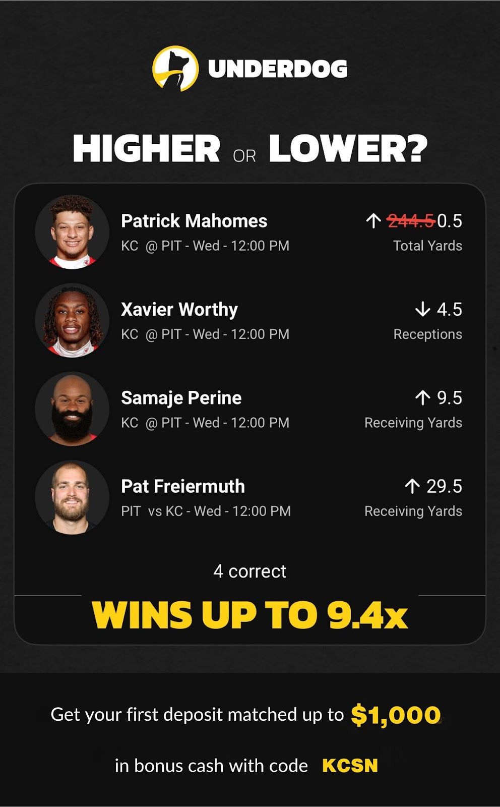 Benny & The ‘Buy-Ins’: Higher/Lower Picks for Chiefs at Steelers on Underdog Fantasy, by Ben Heisler