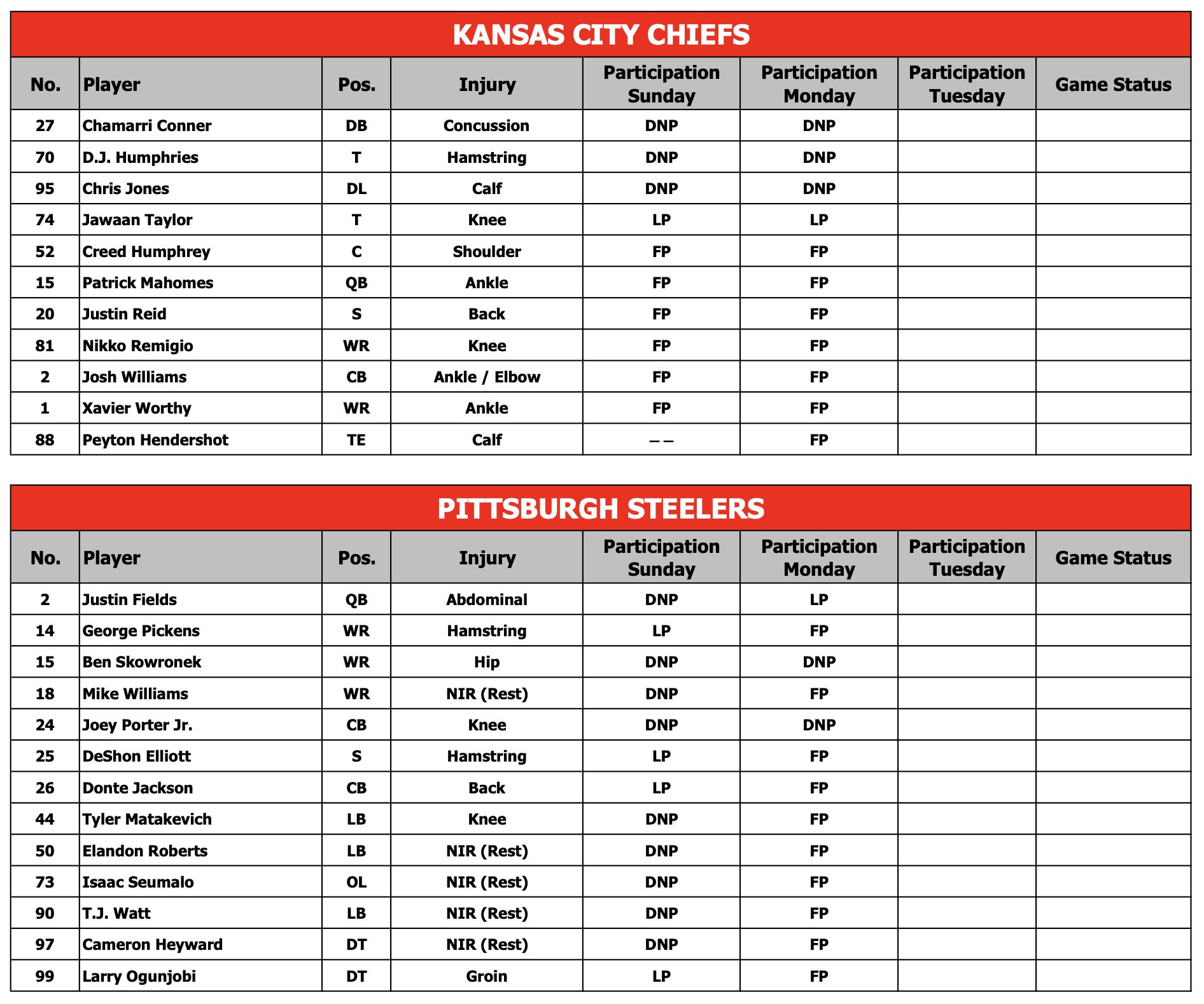 As expected, Chiefs safety Chamarri Conner and left tackle D.J. Humphries will miss another game after missing Week 16. New on the injury list are defensive lineman Chris Jones and right tackle Jawaan Taylor. Jones’ status is looking bleak with such a quick turnaround from Saturday, though he could still practice Tuesday and end up questionable for the game. Meanwhile, if Taylor can’t go, Wanya Morris will jump in for him like he did in Week 16.