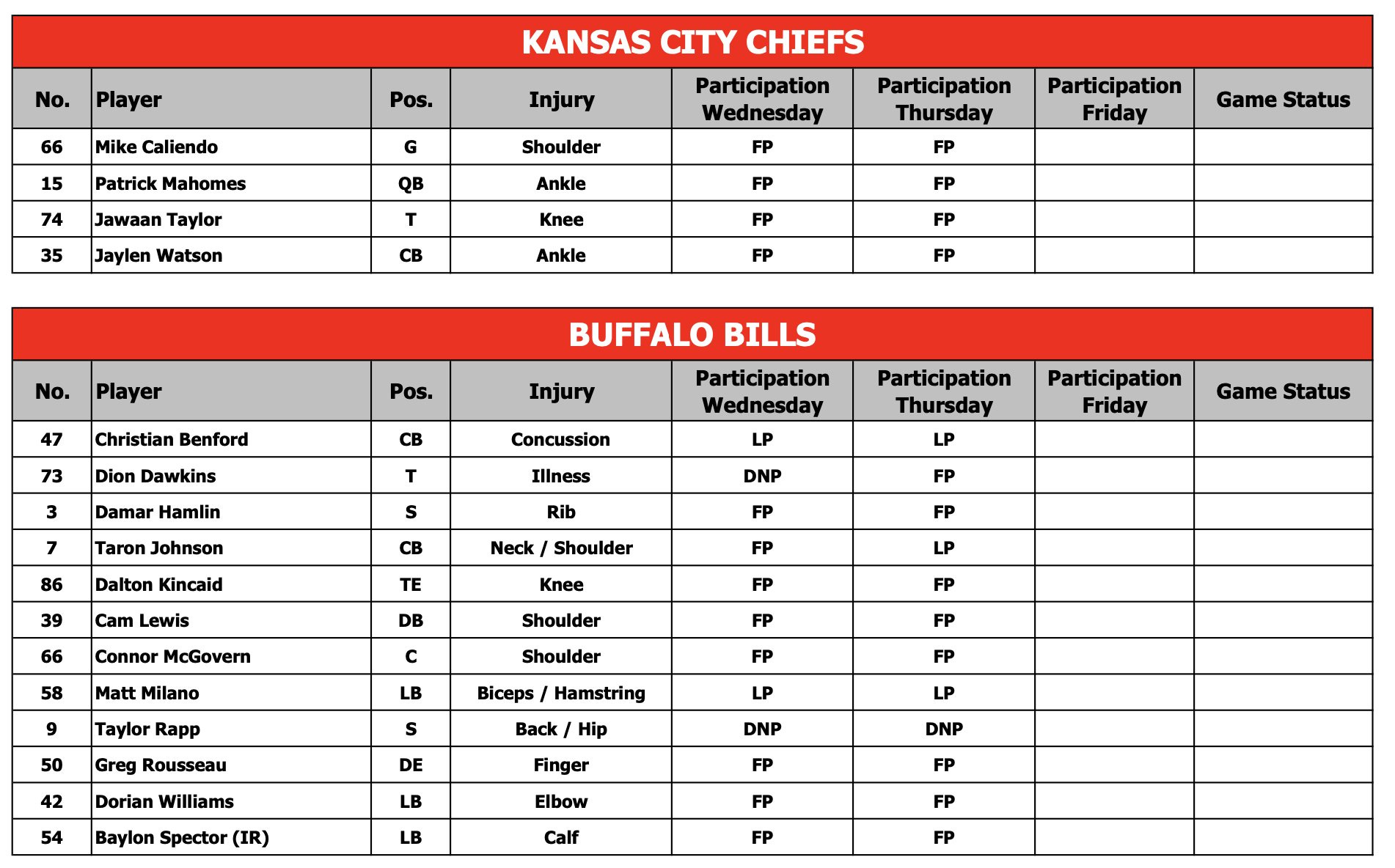 Like last week, the Chiefs are at full strength, minus receiver Mecole Hardman who will officially miss the remainder of the postseason. The Chiefs couldn’t realistically ask for a better injury report heading into this game.
