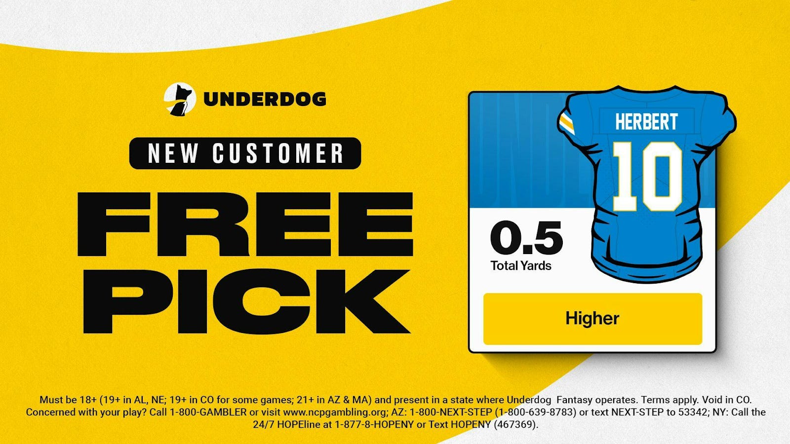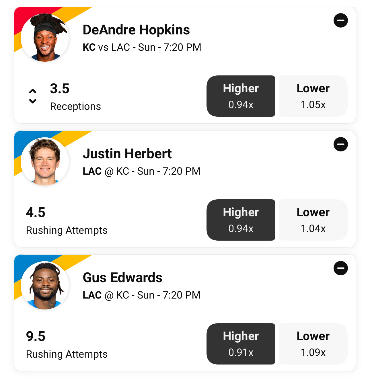While I can’t beat the Herbert “Free Play” for new Underdog players above, I can still recommend another play readily available in his rushing attempts Sunday night at Arrowhead.