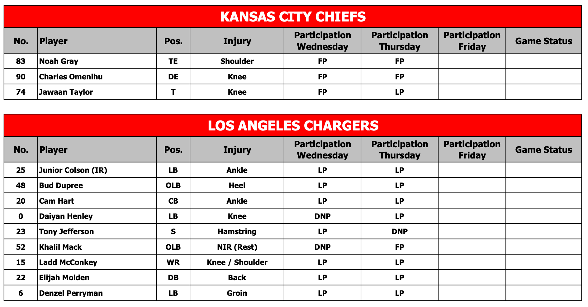 The Chiefs’ injury report is looking great. The only one to monitor is right tackle Jawaan Taylor, who was downgraded to a limited participant Thursday. If he can’t go, the team could slide over Wanya Morris to the right spot while newly-acquired D.J. Humphries takes the left.