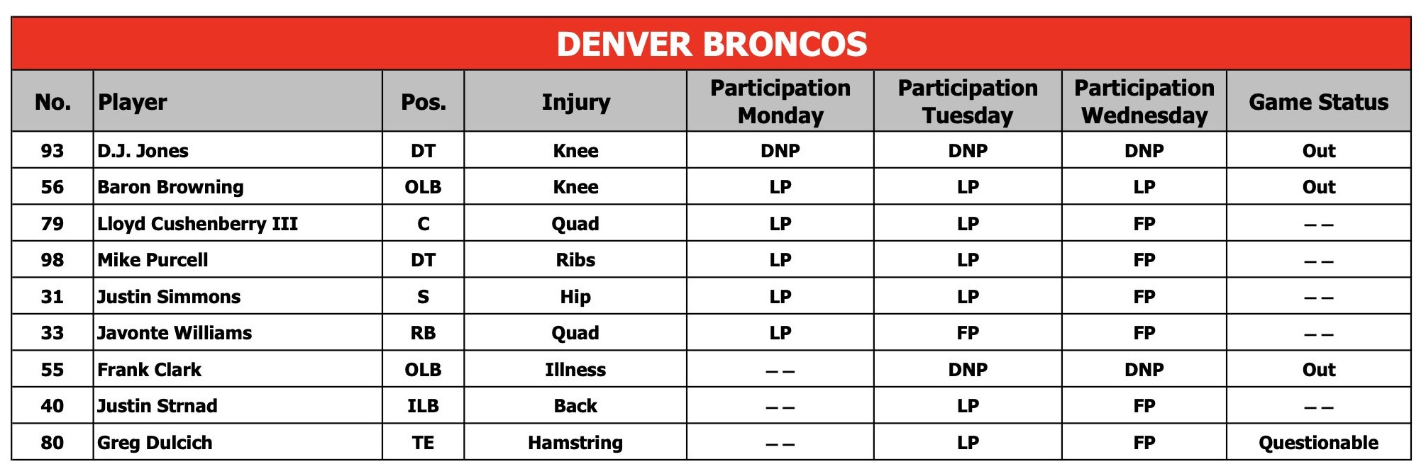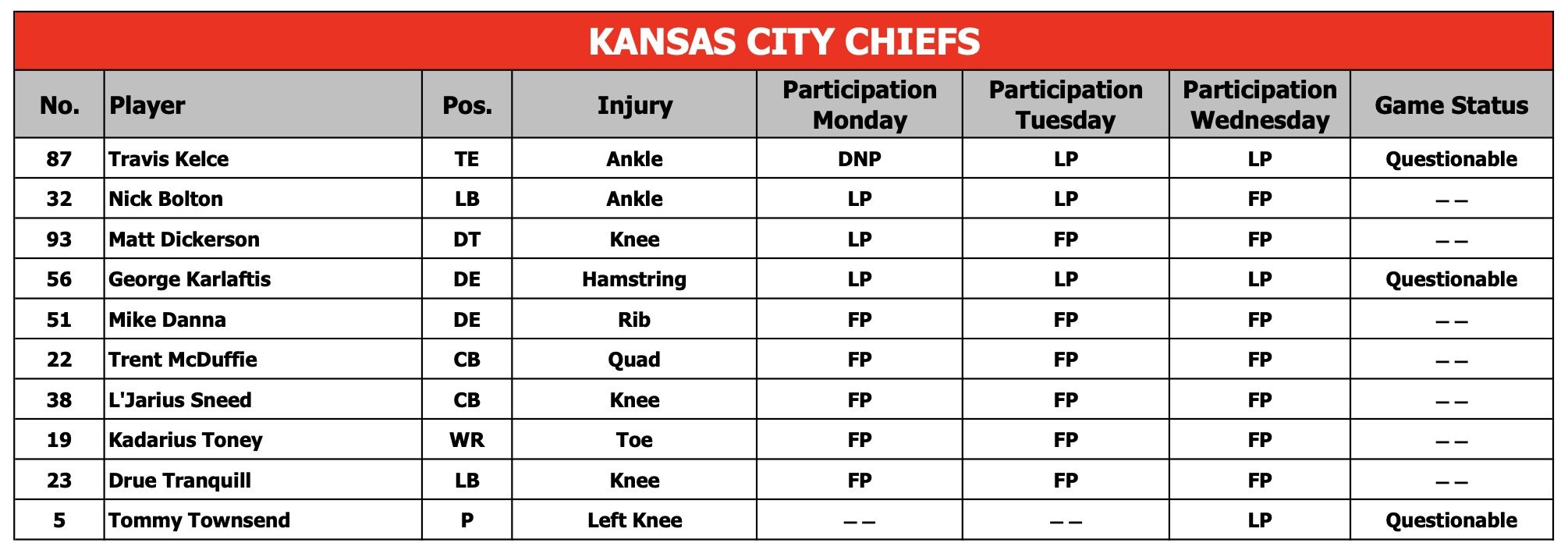 Wednesday Injury Report: