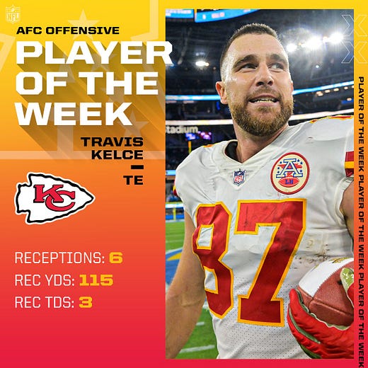 From the NFL: Chiefs TE Travis Kelce was awarded his second career AFC Offensive Player of the Week honor for his Week 11 performance.