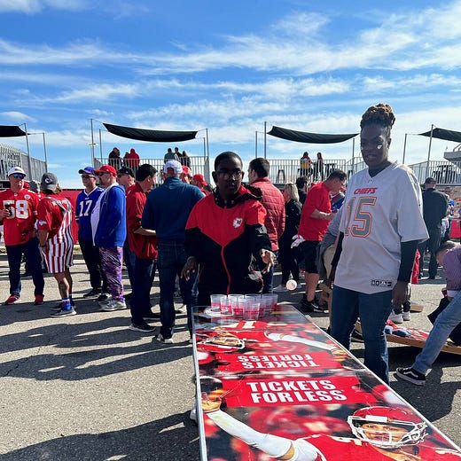 Just like the other winners, Colton and his family came to the Tickets For Less tailgate fully ready to embrace everything that’s great about being a Chiefs fan. It started with some pulled pork barbecue that he said was “super good, but I really like the mac and cheese.” After playing corn hole with his sister Tessa, Colton and family walked into the Arrowhead Pro Shop to make sure they were ready to go before the game began.