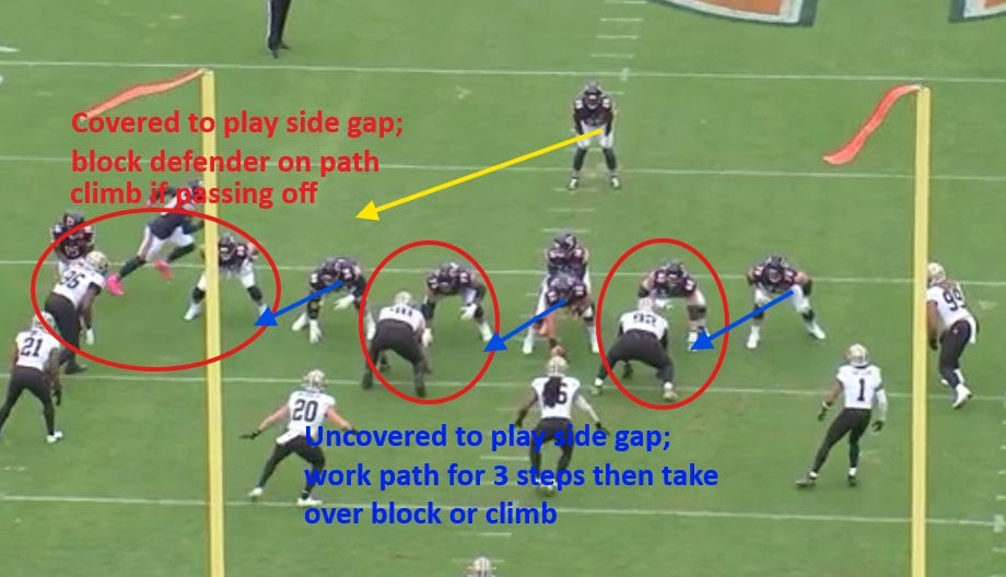 Again, this is a very crude rundown of general Wide Zone blocking, but it gives us a baseline for understanding what is happening on the play. Now it’s time to move on to the window dressing.