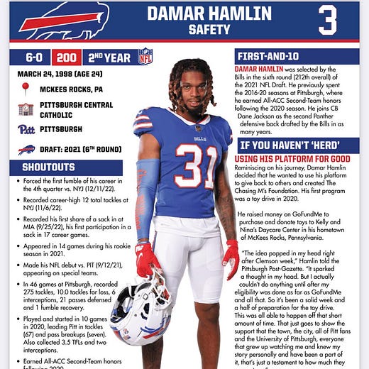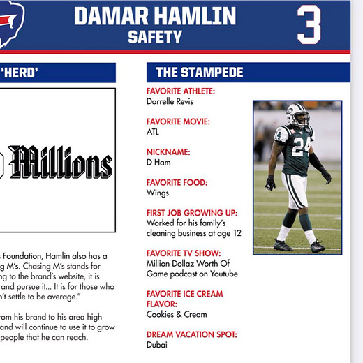From the Bills media guide: If you want to know more about Damar Hamlin — the person and football player — Bills beat reporter Sal Capaccio shared his pages from Buffalo’s media guide.